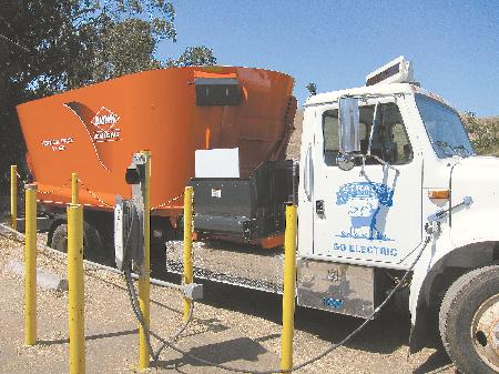 Ultra-quiet and efficient, the truck's electric motor produces 170 hp., and 950 ft.-lbs. of torque, enough to haul, mix, weigh and unload 9 tons of feed. The 2 vertical mixing augers and the unloader are driven by a pto from the truck's transmission. Straus says "It doesn?t have the speed of a diesel, but it has more torque and easily handles a full load."