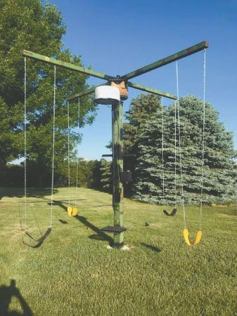 With a few miscellaneous parts and a wheelchair motor, Scott Stetzel built a carnival-type swing for his kids, who are held in place by centrifugal force.
