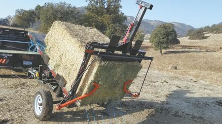 One person can haul a big square bale to pasture and then flake it apart with this new trailer-mounted bale flaker/feeder invented by rancher Terry Atkins of Visalia, Calif. It was introduced at the recent World Ag Expo in Tulare, Calif.