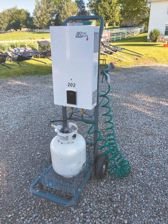 Water can be heated up to about 140 degrees Fahrenheit, but the temperature can be adjusted. The unit provides up to 4 gpm. “A 20-lb. propane tank will last 5 to 10 hrs., depending on how much water you use,” says Yoder.