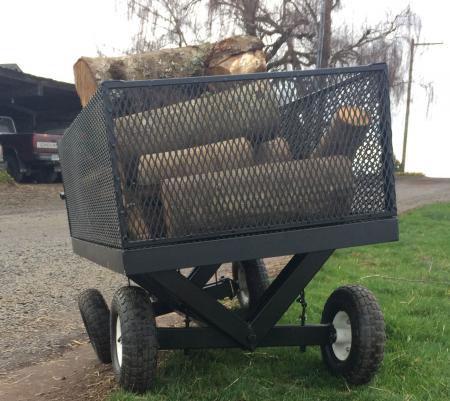 The cart measures 4 ft. long by 2 ft. wide and rides on 10-in. wheelbarrow tires. It has removable 1-ft. tall, expanded metal sides and an expanded metal floor. It can be pulled either by hand or behind a small tractor.