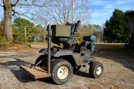 He started out with the chassis of an old 6-speed, 42-in., Craftsman riding mower. It had the shifter on a fender, which would allow him to reach it even though he was reversing the operating direction of the old mower.