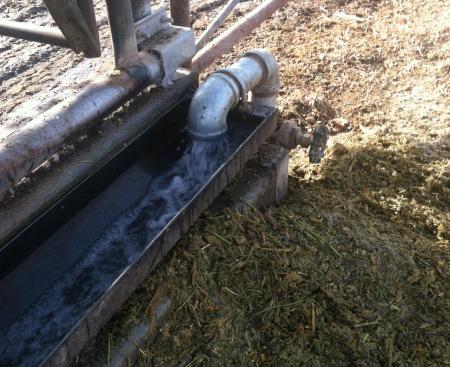 Dean Swager keeps his dairy herd well-watered with constantly running water at their feed bunks. His patented watering system lets them alternate bites of feed with a drink of water. He says the result is more milk with less feed.