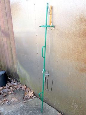 About 8 in. from the bottom, he bent a piece of the 3/8 rod to form a step to help push it into the ground. He added a chain just above the step to fasten around the roasting rods for transport and storage.