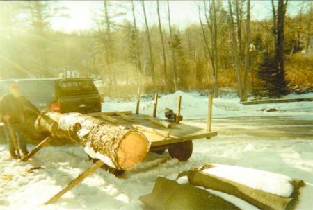 Tim Ojala, New Ipswich, N.H., hauls logs on a 6 by 10 flatbed that’s set up to operate the way trailers did back in the horse logging days.
