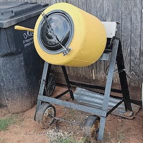 No longer needed for concrete, Krueger has turned the mixer over to his wife to use for compost. She adds chopped-up kitchen waste to other materials, including enzymes and water, to make compost for the garden.