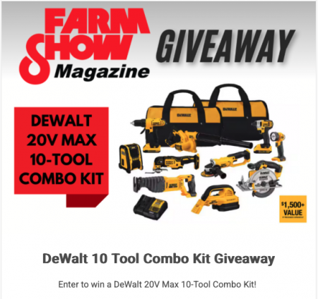5. Prizes: The Winner of the Campaign (the “Winner”) will receive a DEWALT 20V MAX Cordless 10 Tool Combo Kit with (2) 20V 2.0Ah Batteries, Charger, and Bag. Actual/appraised value may differ at time of prize award. The specifics of the prize shall be solely determined by FARM SHOW Magazine. No cash or other prize substitution shall be permitted except at FARM SHOW Magazine discretion. The prize is nontransferable. Any and all prize-related expenses, including without limitation any and all federal, state, and/or local taxes, shall be the sole responsibility of Winner. No substitution of prize or transfer/assignment of prize to others or request for the cash equivalent by Winner is permitted. Acceptance of prize constitutes permission for FARM SHOW Magazine to use Winner’s name, likeness, and entry for purposes of advertising and trade without further compensation unless prohibited by law.