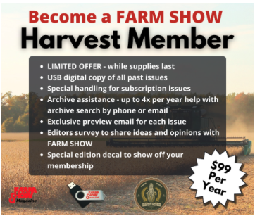 Become a FARM SHOW Harvest Member. For only $99, your subscription will include a USB digital copy of all past issues, special handling for mailed issues, archive assistance - up to 4x per year help with archive search by phone or email, exclusive preview email for each issue, editors survey to share ideas and opinions with FARM SHOW, and a special edition decal to show off your membership! Limited offer, while supplies last.