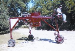 The 3-wheeled machine carries Kuchera about 8 ft. off the ground. It has a single lug-type drive wheel on front that came off an old pivot tower. The rear wheels are off a Ford Escort and are spaced 10 ft. apart to span four 30-in. rows. The frame was made from 1 1/2 by 3-in. sq. tubing. Power is supplied by the Escort's 4-cyl. engine which mounts on a frame 8 ft. above the ground, between the two rear wheels. The engine belt-drives a 25-gal. hydraulic pump, which powers an orbit motor that chain-drives the front wheel.