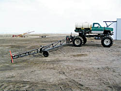 The 600-gal. imperial tank and cradle came from an old pull-type sprayer he had on the farm. Denis installed air bag shocks between the tank cradle and the sprayer frame.