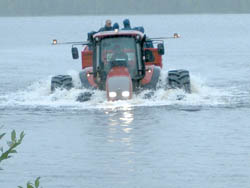 Pekeija Ltd. says, however, that the unit will be most popular in low water, like that found in the following operations: rice or cranberry production, peat moss harvesting, cleaning operations such as collection of waste oil, and cutting the overgrowth of grass on the bottom of lakes and rivers. Also, farmers who have fields on the other side of a river or any body of water, no longer need to use a bridge, but can just drive through the water.