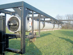 The open ends of the pipe are sealed by 10-in. expansion plugs that Marshall got from a marine supplier in Florida. He fills it through a T-spout at the front end.