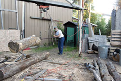 Once a load of 8-ft. pulp logs is delivered, Struble uses a tractor loader to position them near his boiler. He then cuts them in two and drills a 4-in. deep, 1-in. dia. hole in one end of each log.