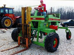 Tim and Tom Nelson, Carlinville, Ill., made their Owatonna mower a lot more useful during the off season by mounting a forklift mast on front of the mower.