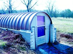 Using his backhoe, he dug a trench into the side of a hill, making it wide enough to accommodate the roof and deep enough to give him 8 ft. of head clearance in the center. To support the roof, he laid railroad tie support walls on the sides. Dirt was backfilled around the side and end walls. The open end was closed in with wood and a storm door installed.