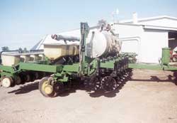 "The planter took about 9 months of spare time to build, weighs 9 to 10 tons loaded, which puts about 1 1/4 tons of load on each tire when raised and about 1 ton on the drawbar."