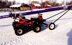 The auger is cranked up or down by a hand-operated winch that mounts on the driver's right side. Because the auger is balanced -- like a teeter totter -- it moves easily. The arm on front keeps the auger's frame rigid, acting as a fulcrum. "It takes less than a minute to hook up or unhook, so you can still use your ATV for other jobs," says Dennis. "I've used it on my farm for the past two years. My kids used to hate moving our auger. Now it has become a fun job for them and they fight over who gets to ride the ATV. The unit is equipped with a jack, but it doesn't do any lifting. It simply provides a range control for how high you want to raise the auger."