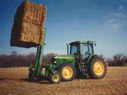 The actual fork and bale carrier attaches to a mast similar to that on a forklift. The fork can pick up and carry two 4 by 4 by 8 big square bales.
