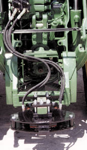 What's more, Miller has developed an automated hitch system that automatically shifts the hitch from side to side by reading the level of the slope. "It's the first automated guidance system for pull-type equipment," he says. A level switch mounts in the cab. It controls an electro-hydraulic valve mounted on the hitch that shifts the drawbar back and forth. A light bar in the cab tells the operator where the hitch is at any given time. Miller has a prototype in the field and plans to complete testing this year and have units on the market early in 2001.
