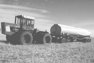To reduce down time spent running for water, Dave Kirby, Rouleau, Sask., converted a 7,000-gal. aluminum semi tank into a low-cost "nurse truck" that he pulls with his 4-WD tractor from field to field. He bought the semi tank at a salvage yard. It had been in a rollover accident but wasn't seriously damaged other than a dent on one side. He bought a used converter dolly at a salvage yard and mounted a drawbar hitch on front of it. He mounted an 8 hp Briggs & Stratton gas engine coupled to a pump under the tank. A hose delivers water from the tanker into the 800-gal. tank on his Bourgault 100-ft. pull-type sprayer. He loads the tank at a local water tower via a fill hole on top of the tank. "It greatly reduces the number of trips I have to make for refills," says Kirby. "I spray 4,000 to 5,000 acres a year, and my farthest field is about 20 miles from home. Lots of times I can spray for three or four days before I have to refill the tank. The tanker's pump fills the sprayer tank about as fast as it takes to get the chemical into the tank, so I have very little down time in the field. I had been using a 1,000-gal. tank on back of my 3-ton pickup and it seemed like I was constantly driving back and forth for water. "Quite a few of these semi tankers have been taken off the road for safety reasons, as far as hauling hazardous goods like fuel or fertilizer goes. But they work fine for hauling water."