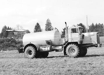 "It's the heaviest-built manure spreading truck I've ever seen yet it causes almost no compaction because of the big flotation tires," says Cornell Van Jaarsveld, Duncan, B.C., about the articulated 4-WD mining truck he converted to haul manure. He uses it year around to spread dairy manure for 25 customers. He got the Volvo truck after it crashed and burned. "I wanted the frame because those rock-hauling trucks have real tough frames," Van Jaarsveld says. "I stripped it down to the bare frame, then replaced and resealed the bearings in the front axle and completely redid the disc brakes because they were so badly damaged in the fire. The transfer case and rear axle were fine." He bought a 1968 Kenworth logging truck for its rebuilt 335 hp Cummins diesel engine, which he used to repower the Volvo. He re-placed the fire damaged 6-speed automatic transmission with a 15-speed manual trans-mission out of a 1975 milk truck. He decided only a Kenworth or Peterbilt cab would handle rough spreading conditions and eventually found a 1985 Kenworth logging truck. It included cab and mounting brackets, hood and muffler system. Next came time for wheels and tires. "I was watching 'Monster Trucks' on TV and saw them go through mud and water," TV he says. "I figured that was what I needed." The 66 by 43 by 25-in. tires he bought are designed for use on log skidders. They're 5 1/2 ft. tall and 4 ft. across. Rims were made from 24-in. dia. pipe cut into 42-in. sections, with outside bead rims from off-road logging trucks welded to the pipe sections. The center discs came from Volvo truck rims. A 2,500-gal. tank, custom rolled for Van Jaarsveld at Loewen Welding and Manufacturing, mounts on back of the truck. On back, he also mounted a 10-in. dia., 12 ft. long boom and Wally 750 vacuum pump, which fills the tank in just 2 1/2 minutes. One of the hardest parts of the project, Van Jaarsveld says, was repowering the Volvo truck with the Cummins diesel. "The Volvo transfer case only had mounting brackets on bottom so you had to perfectly line up the transmission so the U-joints stayed exactly in line to prevent vibration," he says. "That was very time-consuming." Plumbing air lines and hydraulics and then rewiring the truck was also difficult because it all had to be done from scratch, he adds. Once put together, the truck was painted yellow with white striping. "I spent about eight months on the truck," he says. "It works great. The flotation tires get me through even the muddiest conditions and articulation lets me get into even the tightest spots."