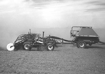 Ever since Deere stopped making its HZ hoe drill, farmers who summer fallow or farm hilly ground have had to rebuild the machine, or rely on big drills designed for Midwest conditions. A new split packer, deep furrow air seeder designed by a Washington company provides an alternative. Coombs Mfg., of Spokane, says its new rig, which is compatible with all major air carts, offers a number of features: -- A 3-section drill frame that can flex on hilly ground. -- Independently mounted boots and split packer wheels that provide individual depth control for accurate seed placement. -- Spring-loaded rock trip. -- Hydraulic fold for fast, easy transport. "It's a compact unit that works well even on the hilliest ground and keeps seed depth consistent," says David Coombs. "We recently bought out the agricultural division of Calkins Equipment and used their expertise to design the rig. Like the HZ, it's equipped with boots that dig 6-in. deep furrows in order to reach moist soil. The split packer wheels press soil in against the seed trench. "However, our rig offers many benefits over the HZ. It has much more capacity so you don't have to refill as often. It works great with air carts so the weight of the seed is kept off the frame, reducing stress on it. The depth of the boots can be controlled by adjusting a spring-loaded pin. Spring pressure on the boots and packer wheels can also be adjusted. Each packer wheel is made up of two halves, and they're designed so that they can rotate in opposite directions in order to dislodge rocks. "We built two 36-ft. wide prototypes last year and they worked great. We plan to offer other sizes in the future. The boot-packer wheel units can also be retrofitted to existing tillage implements." .