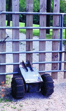 Dale McCaslin, Kansas City, Mo., used a Sears chain-driven garage door opener and the rear wheels and axle off an old riding mower to build a rugged "remote control" gate opener.