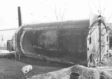 Hiawatha, Kan., farmer Doug Grimm has a new way to put his wheat straw to work: he burns it in his big bale burner that heats his greenhouses and a couple of other farm buildings. Grimm converted an old railroad tank car to burn big round bales of wheat straw. Air pipes transfer heat to water which is then pumped through in-floor heating systems and radiators. "We've used it for three years. In the coldest weather it saves us in energy costs," says Grimm, who grows a corn, beans, and wheat rotation and also runs a greenhouse operation where he grows tomatoes, strawberries, and flowers. "We had been using propane to heat the buildings, but it got too expensive. Now we use only the bale burner to supply the buildings with heat." He paid for a 26-ft. long, 10-ft. dia. section that had been cut off a 60-ft. rail-road tank car. One end of the tank was closed. A local blacksmith welded a steel divider inside the tank to separate it into a 16-ft. fire chamber and a 10-ft. long water tank. The water tank holds 3,000 gal. Water is heated to about 180 degrees through a series of air pipes that runs from the fire chamber through the water tank. The pipes run to a steel box that's welded to the end of the tank. An exhaust stack equipped with a small fan and motor is used to pull air through the pipes. Thermostatic-controlled pumps inside the greenhouses circulate hot water through copper pipes buried under the floors of the buildings. Cooled water from the buildings then returns through 1 1/2-in. dia. insulated pipe. The pipe runs through a steel jacket welded on top of the burner area. Water is heated as it flows through the steel jacket and back into the water tank. The fire chamber is equipped with a pair of 1/2-in. thick steel "water jacket" doors with a 3/4-in. layer of water inside them. "Water flows through the doors to keep them from warping under the intense heat," explains Grimm. A small electric pump takes water from the bottom of the water tank, where it's the coolest, and pumps it through pipes that run down along each side to the doors. The pipes are plumbed into the bottom of each door. Another pipe at the top of each door carries water back to the tank. Fresh air inlets in the bale burning chamber keep the fire burning hot and clean. A length of 3-in. sq. steel tubing runs down along each side of the tank and along the back wall to provide fresh air. Holes drilled into the tubing allow the air to be injected right before heated air goes into the air pipes. "It works good. I built it because I couldn't find anything on the market that was affordable and could do the job I wanted," says Grimm. "I load bales into the burner with a front-end loader. The burner is big enough to hold up to round 3 bales at once, but I burn only one bale at a time. It takes about a day to burn an entire bale. Burning straw heats the water to only about 140 degrees, and when it's real cold outside it takes 180-degree water to keep the greenhouses warm. So during the winter I also burn scrap wood which causes the fire to burn hotter. I get the wood from a local manufacturer."