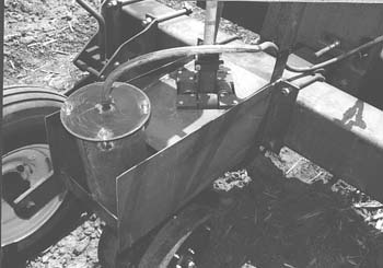 To build the test unit, Litchfield used the support wheels and "V" closing wheels off an old Deere corn planter, the seed box off an Allis-Chalmers planter, and the gauge wheels off an International planter.