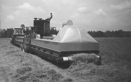 "But we felt it also should be tested in heavier hay. So we tested the machine for two months this summer on 55 acres of heavy alfalfa at the farm of John Roe, a Milverton, Ontario, commercial hay producer and entrepreneur. We found we needed to increase air flow with heavier, wetter hay because we were getting too much steam and condensation inside the drying chamber. We installed a bigger fan and some ductwork in the aluminum housing over the conveyor belts to solve the problem."