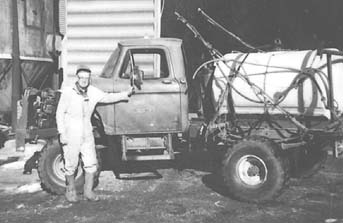 He put an articulation joint just behind the cab and mounted a hydraulic cylinder on each side to steer the truck. A 400-gal. poly tank mounts on back with a 30-ft. long, 3-section boom from an old home-built, pull-type sprayer.