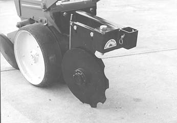 The Nutrimate II consists of a 14-in. dia. leading notched blade and a 12-in. dia. smooth blade. The notched blade runs parallel to the planter's V-opener without disturbing the soil between the fertilizer and seed opening.