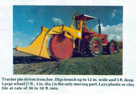 The trencher handles corrugated plastic or clay tile up to 8 in. in dia. In average soil conditions, and tiling at a depth of 3.5 ft., it lays 30 to 50 ft. of tile per min.