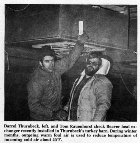 Last fall, Darrell Thurnbeck, Forest Lake, Minn., had the Rauenhorsts install the Beaver System in a barn used to house 300 breeder turkey toms. Thurnbeck figures the exchanger, complete with fans, replaces an 86,000 btu furnace and the fuel to operate it.