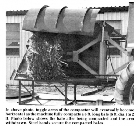 The accompanying photos show a prototype compactor designed and built by Iowa State University students enrolled in a design course taught by Dr. Buchele. It features a double toggle mechanism connected together by two double acting hydraulic cylinders which serve as the driving link to compress bales 6 ft. long and 6 ft. in dia. to only 2 ft., long.