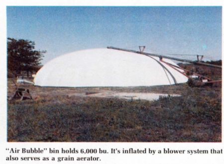 The 6,000-bu. "air bubble" bin has no structural framework. It's inflated by a blower system that also serves as a grain aeration unit.