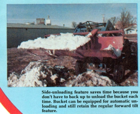 It's the new "positive ejection" bucket from Dohrman Manufacturing, Emerson, Neb. It's designed to do everything conventional snow or silage buckets will do, but it has the added advantage of automatic side unloading. A chain-drive ejector plate or arm moves across the bucket to push the load out either end. The hydraulically operated arm sweeps off a bucket full of snow or silage in less than 3 seconds.