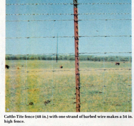 Cattle-Tite is available 42 or 48 in. high. In either size, the horizontal wires are 6 in. apart and the vertical stays 9 in. apart. The extreme top and bottom wires are 10 ga., and all other wires 11 ga.