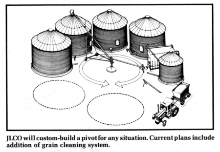 For just a fraction of the cost of a "leg" system you can install the new JLCO Pivot Transfer Auger, a grain transfer system that will service up to 13 grain bins, according to Chet Blair, sales manager for JLCO, of Dassel, Minn.