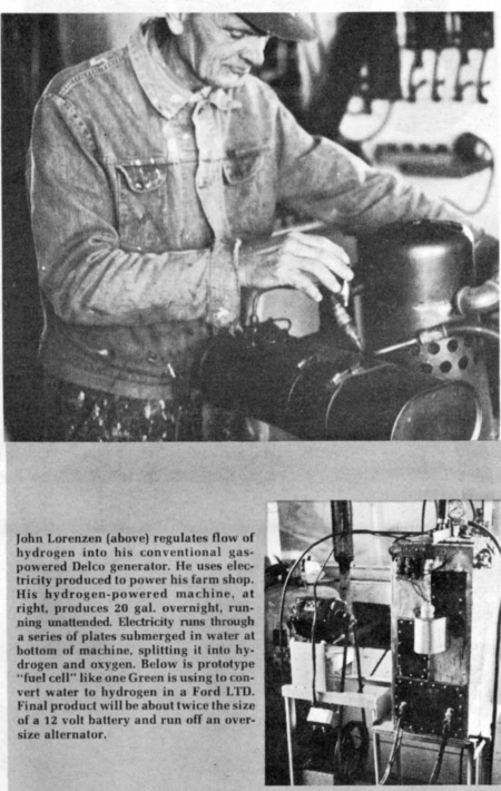 Another Iowan, Kenny Green, from Carson, borrowed Lorenzen's hydrogen designs with the idea of developing a commercial unit. He not only has converted a Ford LTD to run on water but is preparing to market a conversion kit to farmers that will fit any car, truck, or tractor. Green says the key to development of his commercial unit "was understanding Lorenzen's experiments. They paved the way."