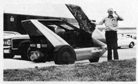 More than half of the vehicle's 2,220 lbs. is in the 13 batteries, which ride only 8 in. off the ground. The car's Volkswagen transmission has four speeds forward and one in reverse. Windows are plexiglass and the body aluminum. The car's electric motor was obtained from a truck company that had used it in an experimental electric truck. Heat given off by the batteries is directed inside to keep the driver comfortable in cold weather.