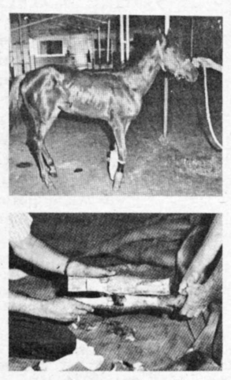 Bud Beaston has developed hinged prosthetic leg braces for horses, cows, calves, bulls, and sheep. He first makes a mold of the injured or abnormal leg with plaster of paris, then builds a hinged cast that clamps around the leg. Pressure points inside the case are padded with foam rubber.