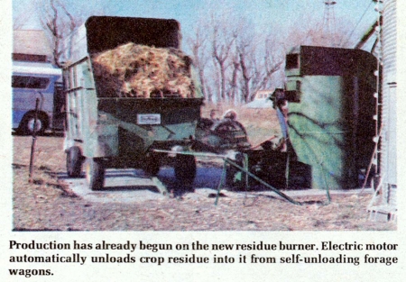 Residue from the combine is blown into any standard self-unloading forage wagon. The wagon is pulled alongside the residue burner where it is slowly unloaded with a simple electric drive Sukup makes. Any other similar method of slow unloading can also be used. A single load of husks and cobs will fire the burner automatically for up to 12 hours, according to Sukup. Heat from the burner can be used in most any existing drying setup.