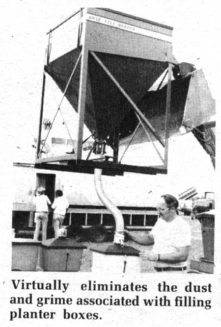"We can virtually eliminate the dust and grime associated with planter box filling," says Tom Trutna. "The airtight hopper is connected by flexible hose with quick-connect couplers to the intakes on the special lids. The flow is controlled by a ball valve at the base of the hopper, delivering the flow directly into the boxes."