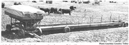 Bill Kurtz, of St. Croix Falls, Wis., built mobile feed bunks out of old house trailer frames. He got the frames from trailer houses that had burned. The I-beams form a solid base on which to weld a steel floor and pipe uprights. Two sets of wagon or car wheels are attached to make the bunks portable.