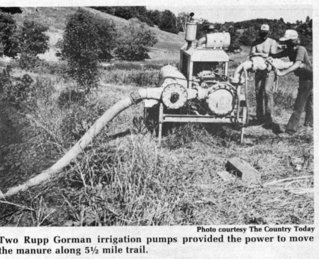 Two Rupp-Gorman irrigation pumps (225 and 285 hp) provided the power. The pump at the start of the line was equipped with a chopper to break up any solids that might clog the line. The second pump was a booster about two miles away.