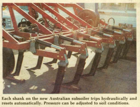 "It's almost impossible for the farmer with rocky soil to use other subsoilers that must be reset manually. The Agrowplow continually jumps out of the way of rocks and other objects and then resets automatically by hydraulic pressure back into position. Pressure can be adjusted to soil conditions. In slightly rocky ground, pressure can be set higher so it will push through smaller rocks," explains William Goins, Jr., of Liberty Machinery Sales, Visalia, Calif., importer of the machine.