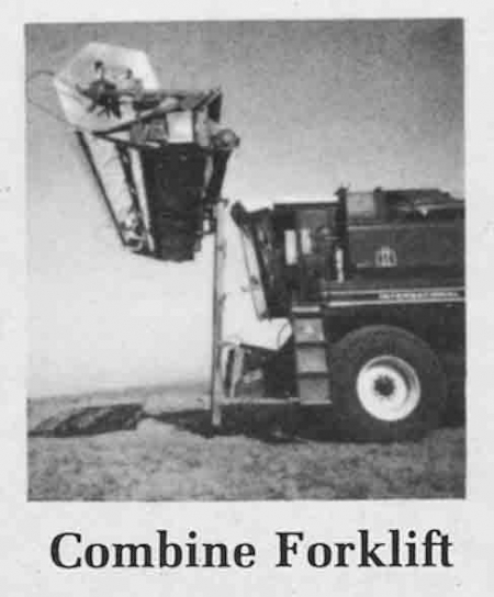 "It will lift a conventional 24-ft. header and pickup reel to a height of about 11 ft. and can be tilted forward and backward while it's lifting, thanks to a diverter valve adapted to the combine's hydraulic system. The combine handles the 24-ft. table with no problem. However, for extra heavy loads around the farm, the base of the forklift can be rested on the ground to relieve the feederhouse of the strain," says Max.