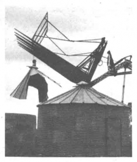 He used a high-reach tractor-mounted hay stacker that he built himself (featured in FARM SHOW's Vol. 6, No. 6) to remove the roof on one bin and to lift the second bin up into mounting position. The bottom ring of the top bin in the photo was removed because of rust. Staffanson overlaid the top bin two corrugations over the bottom bin and used a sharp punch to make bolt holes.