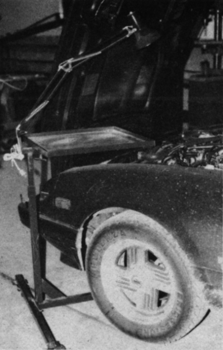 The desk is made from steel tubing and rolls around on creeper casters. Height of the tray is adjustable to reach the top of any auto or truck fender. The desk is equipped with a light and a multiple electrical outlet to power tools. "Gives you a convenient spot to put parts and place tools while working on equipment," says Ferrin.